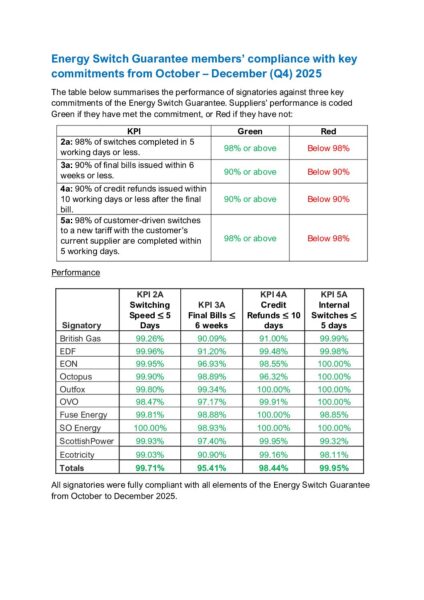 Each quarter, Energy Switch Guarantee signatories are required to submit detailed proof of how they meet set criteria to show they are compliant with the standards of the Guarantee. For October to December 2025, all signatories were fully compliant with all elements of the Guarantee.
