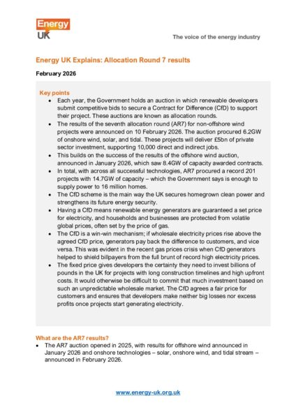 • The results of the seventh allocation round (AR7) for non-offshore wind projects were announced on 10 February 2026. The auction procured 6.2GW of onshore wind, solar, and tidal. These projects will deliver £5bn of private sector investment, supporting 10,000 direct and indirect jobs.