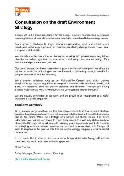 Given its wide-ranging nature, the Scottish Government’s Draft Environment Strategy covers a broad range of environmental issues which Scotland will need to tackle now and in the future. While the Strategy ably scopes out these issues, it is future information on policies and steps to meet these issues that will truly determine how closely the Strategy will be addressed in coming years. A particular point of interest is in managing tensions between development and nature restoration, with Energy UK keen to emphasise the positive role that renewable energy can play in environmental restoration.
