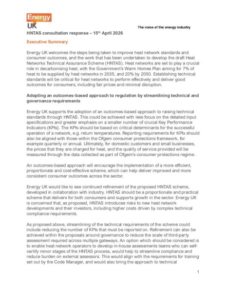 Energy UK welcomes the steps being taken to improve heat network standards and consumer outcomes, and the work that has been undertaken to develop the draft Heat Networks Technical Assurance Scheme (HNTAS). Heat networks are set to play a crucial role in decarbonising heat, with the Government’s Warm Homes Plan aiming for 7% of heat to be supplied by heat networks in 2035, and 20% by 2050. Establishing technical standards will be critical for heat networks to perform effectively and deliver good outcomes for consumers, including fair prices and minimal disruption.