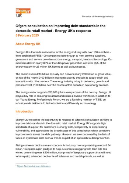Energy UK response to Ofgem consultation on improving debt standards in the domestic retail market