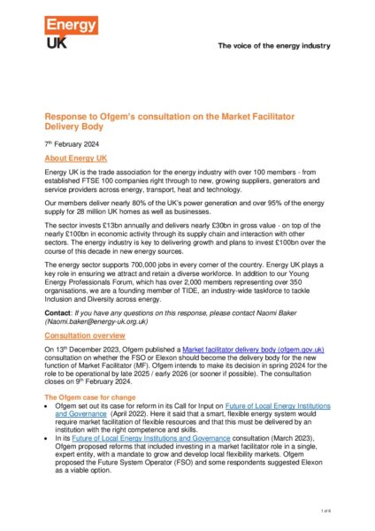 Energy UK welcomes the opportunity to respond to this consultation. Members generally support Ofgem’s decision that local governance reform is needed to deliver the best outcome for consumers and support the new functions of Regional Energy System Planners (RESP) and a Market Facilitator.