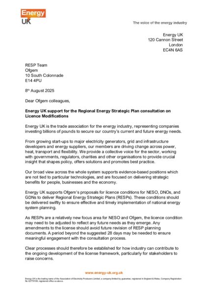 Energy UK response to Regional Energy Strategic Plan consultation on Licence Modifications