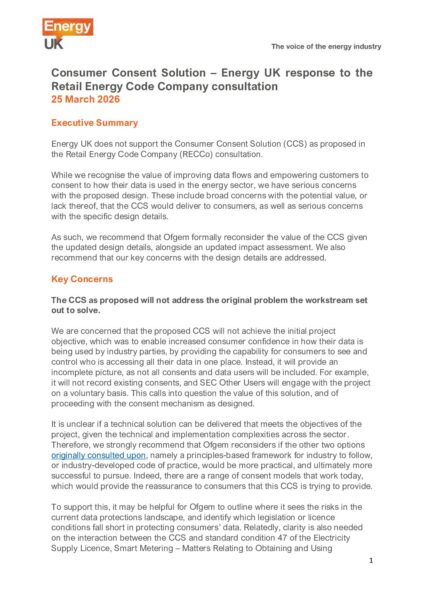 Energy UK does not support the Consumer Consent Solution (CCS) as proposed in the Retail Energy Code Company (RECCo) consultation.